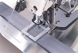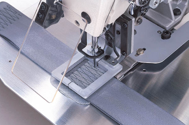 La máquina está equipada con un cabezal DirectDrive de nuevo desarrollo que ofrece excelentes capacidades de costura destinados a materiales de gran peso extra, y un cortahilos hilo caliente que corta hilos gruesos de forma rápida y fiable. Estas especificaciones son las más adecuadas para la costura de los cinturones de seguridad.